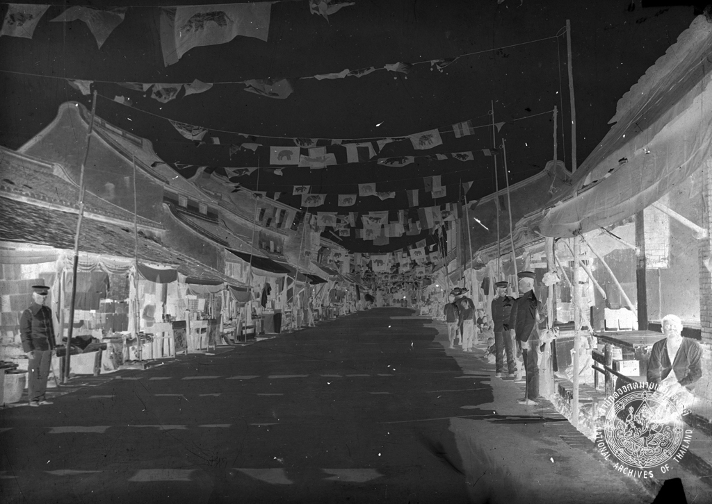 Decorated houses and shops with colored bands and flags by vendors and the people to welcome King Vajiravudh as the Crown Prince at that time, in 1909.