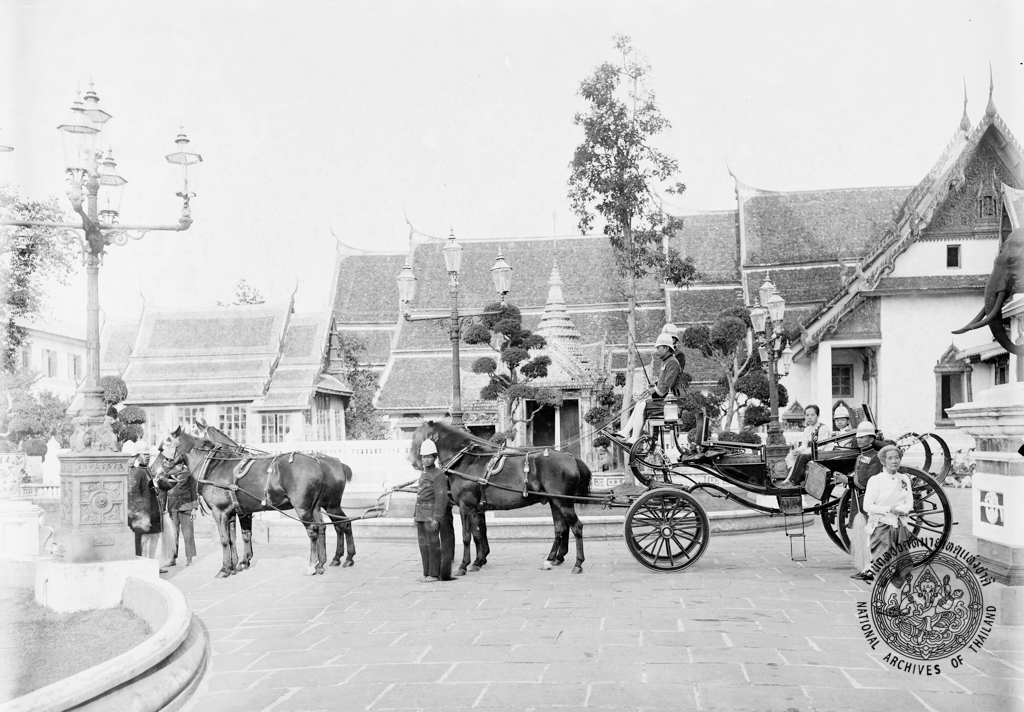 Queen Sri Bajarindra and Prince Prajadhipok (King Prajadhipok) on a carriage in the royal Kathin – robe presentation at Wat Makutkasatriyaram.