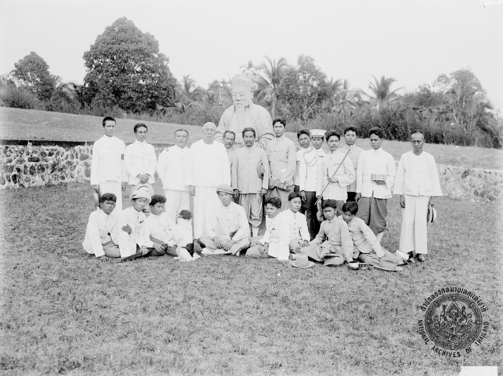 ข้าราชสำนักและข้าราชการ ถ่ายภาพร่วมกันที่เมืองระนอง ในการตามเสด็จพระบาทสมเด็จพระมงกุฎเกล้าเจ้าอยู่หัว เมื่อครั้งยังดำรงพระราชอิสริยยศ สมเด็จพระบรมโอรสาธิราช สยามมกุฎราชกุมาร เสด็จประพาสหัวเมืองปักษ์ใต้ พุทธศักราช ๒๔๕๒